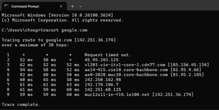- Windows: Open the Command Prompt and type tracert followed by the destination (e.g., tracert google.com).