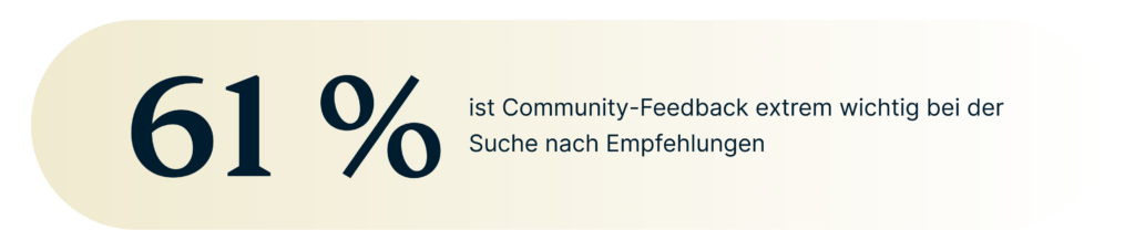 Unsere Umfrage zeigt, dass 61 % der deutschen Befragten Community-Feedback als wichtig oder sogar äußerst wichtig betrachten, wenn es um Empfehlungen geht. Dies unterstreicht die Macht von nutzergenerierten Inhalten, bei denen reale Erfahrungen und Einblicke oft mehr Gewicht haben als rein objektive Informationen.