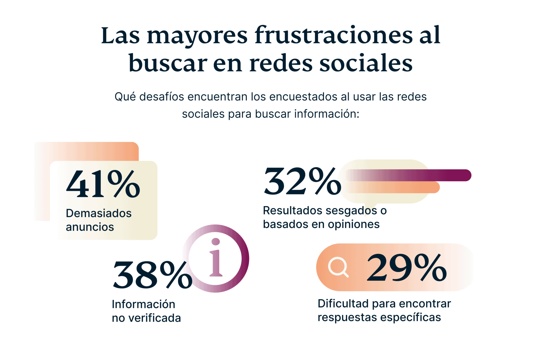 Si bien las redes sociales ofrecen una forma dinámica y atractiva de encontrar respuestas, no están exentas de desventajas. Para muchos usuarios, frustraciones como los anuncios intrusivos, la información no verificada y el contenido sesgado pueden hacer que la experiencia de búsqueda sea menos fluida de lo que parece. De hecho, nuestra encuesta muestra que estos desafíos son la razón por la cual algunos todavía dependen de herramientas tradicionales como Google para ciertas búsquedas.