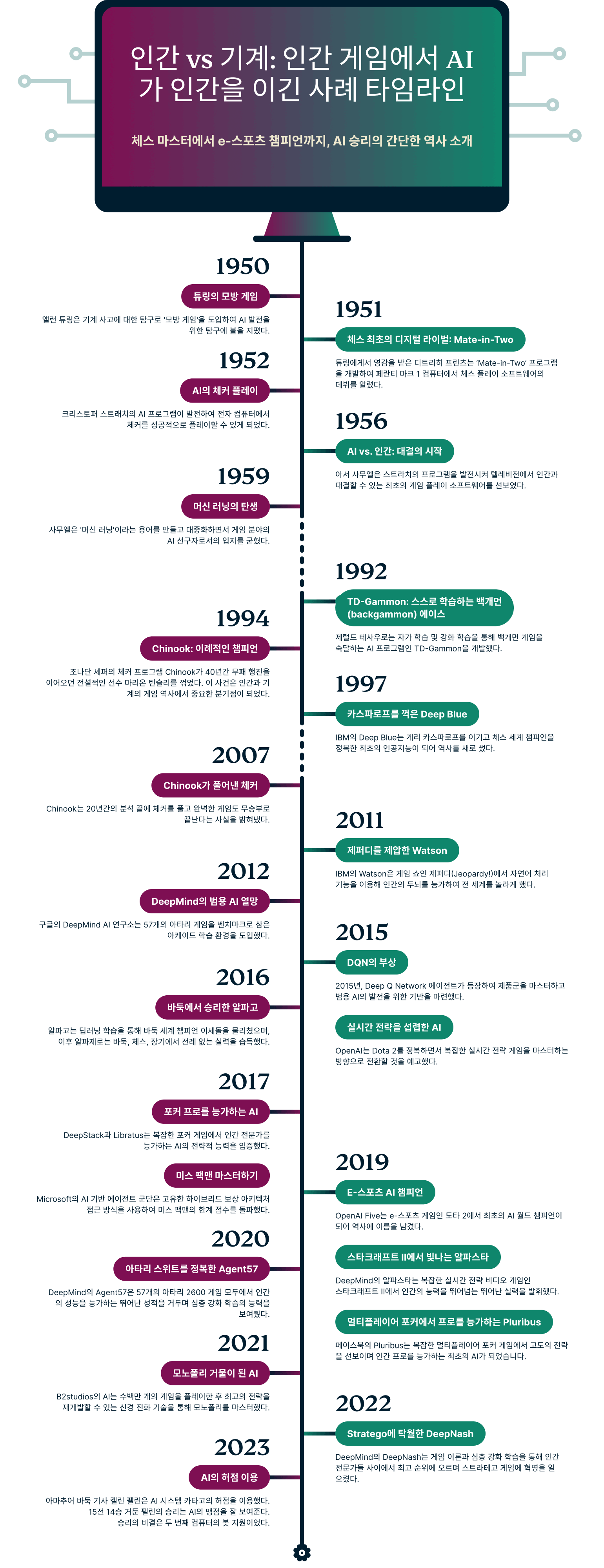 게임 분야에서 AI의 진화는 1950년대 앨런 튜링의 “모방 게임” 개념에서 그 기원을 찾을 수 있습니다. “기계가 생각할 수 있는가?”라는 튜링의 대담한 질문은 AI와 게임의 영역으로 향하는 혁신적인 여정의 발판이 되었습니다.