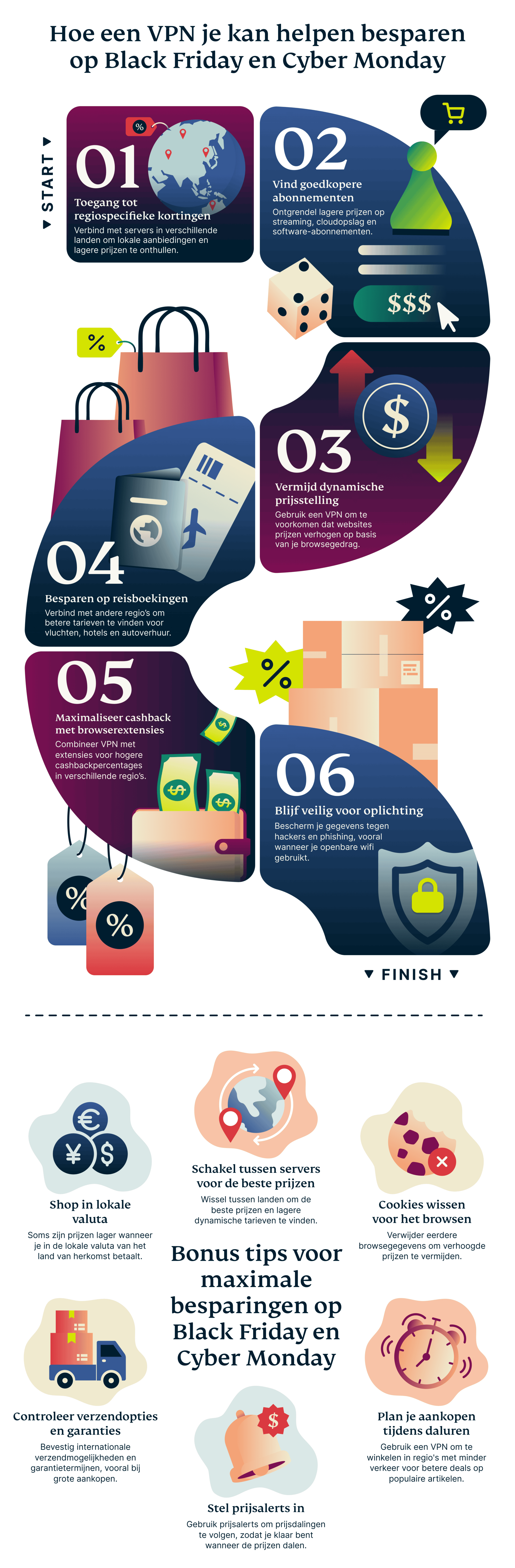 Black Friday en Cyber Monday zijn dé momenten om deals te scoren op van alles en nog wat, van gadgets tot mode. Maar er zit een addertje onder het gras: de prijs die je ziet, is niet altijd de voordeligste. Winkeliers passen prijzen aan op basis van je browse-locatie, wat betekent dat iemand uit een ander land mogelijk een lagere prijs krijgt voor hetzelfde product. Een VPN laat je winkelen als een local, waardoor verborgen regionale kortingen zichtbaar worden, zodat je meer kunt besparen.