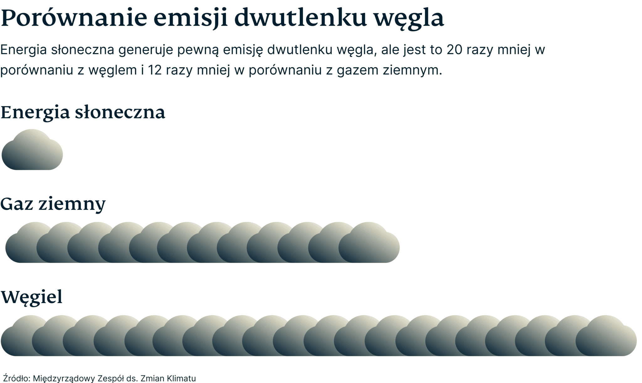 Pozytywny wpływ na środowisko. Produkcja energii za pomocą paneli fotowoltaicznych nie generuje szkodliwych emisji, choć ich wytworzenie wymaga energii, która powoduje zanieczyszczenie środowiska – ale to wciąż znacznie mniej emisji dwutlenku węgla uwalnianych w wyniku wykorzystania węgla i gazu ziemnego w trakcie ich eksploatacji. Według szacunków branży energetyki słonecznej energia elektryczna wytwarzana przez panele fotowoltaiczne emituje 20 razy mniej CO2 niż energia pochodząca z węgla i 12 razy mniej niż energia pochodząca z gazu ziemnego.