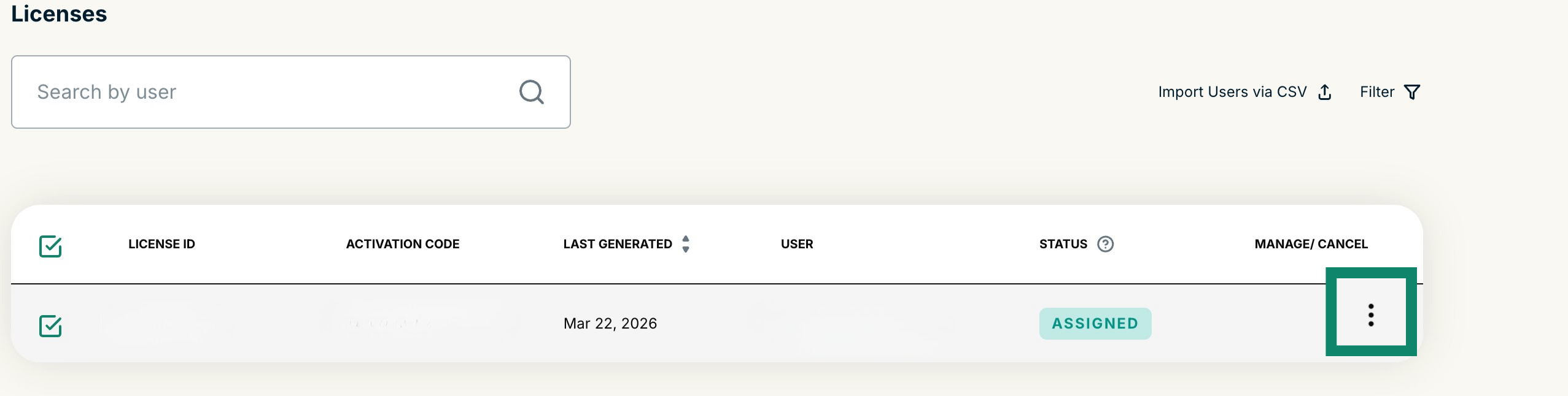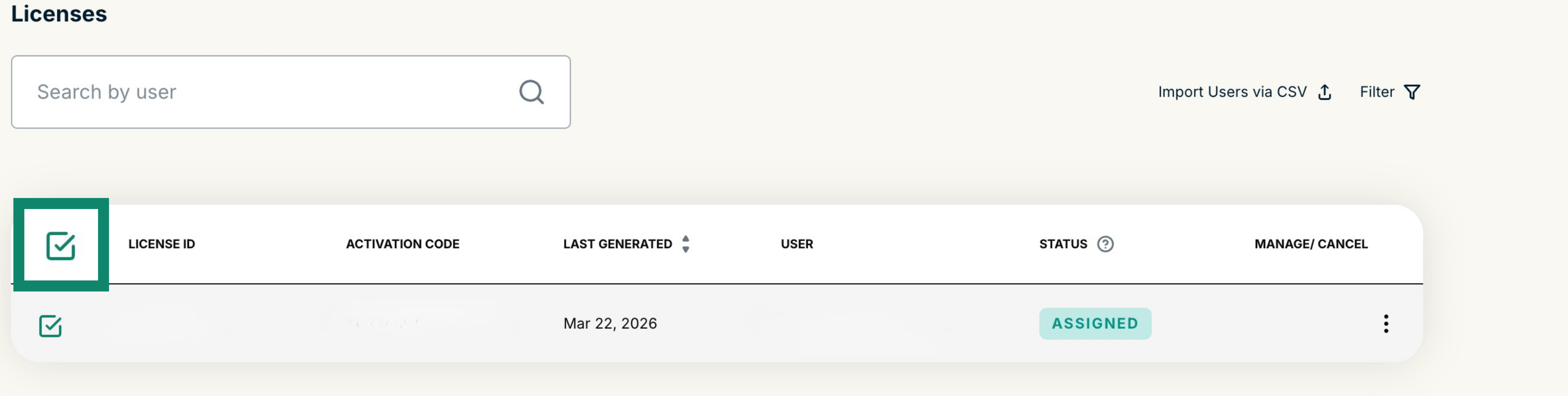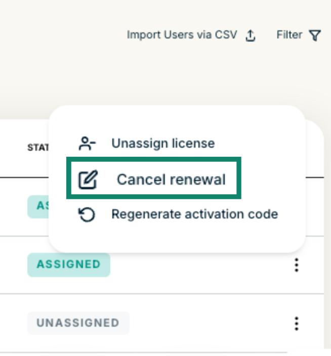- Select the licenses you wish to cancel auto-renewal for by ticking the boxes in the left-hand column under LICENSE ID.