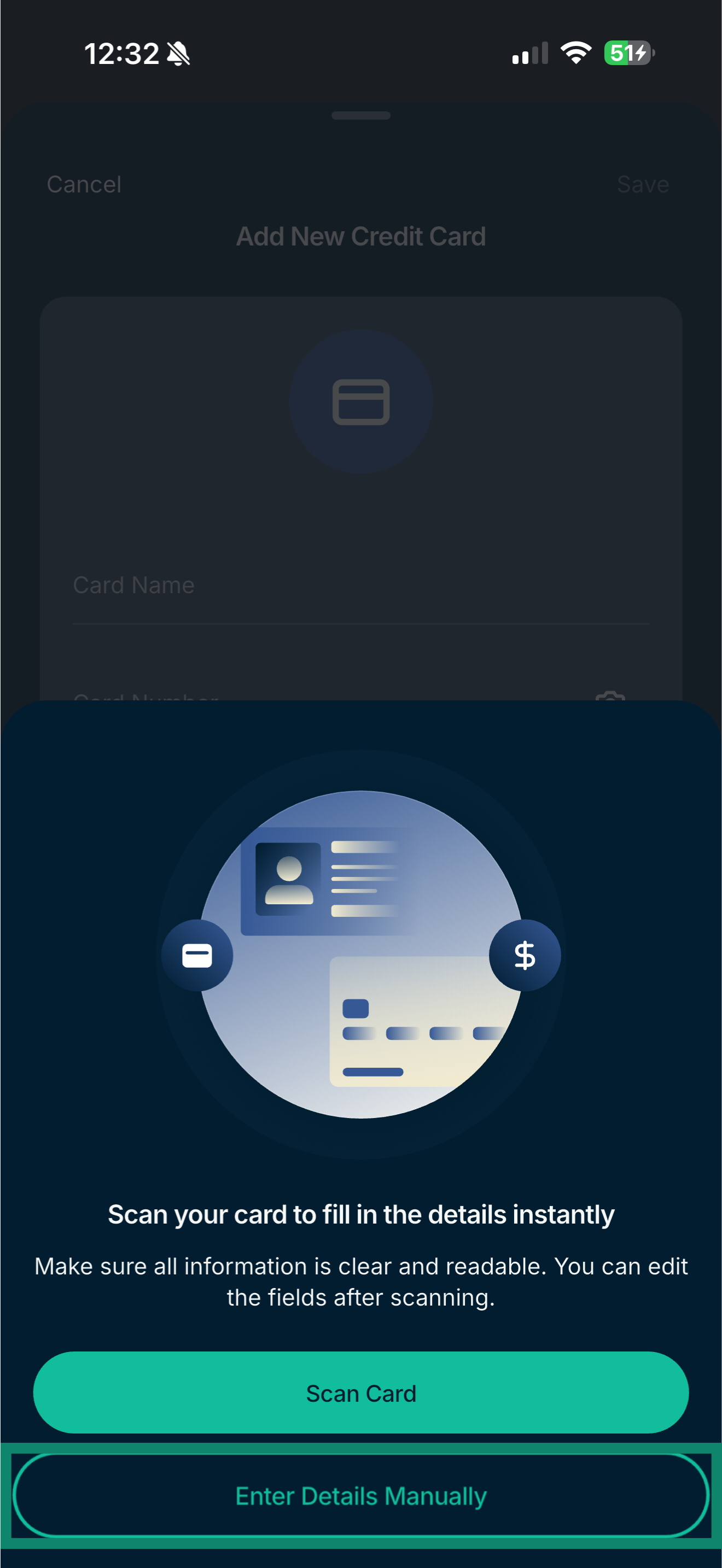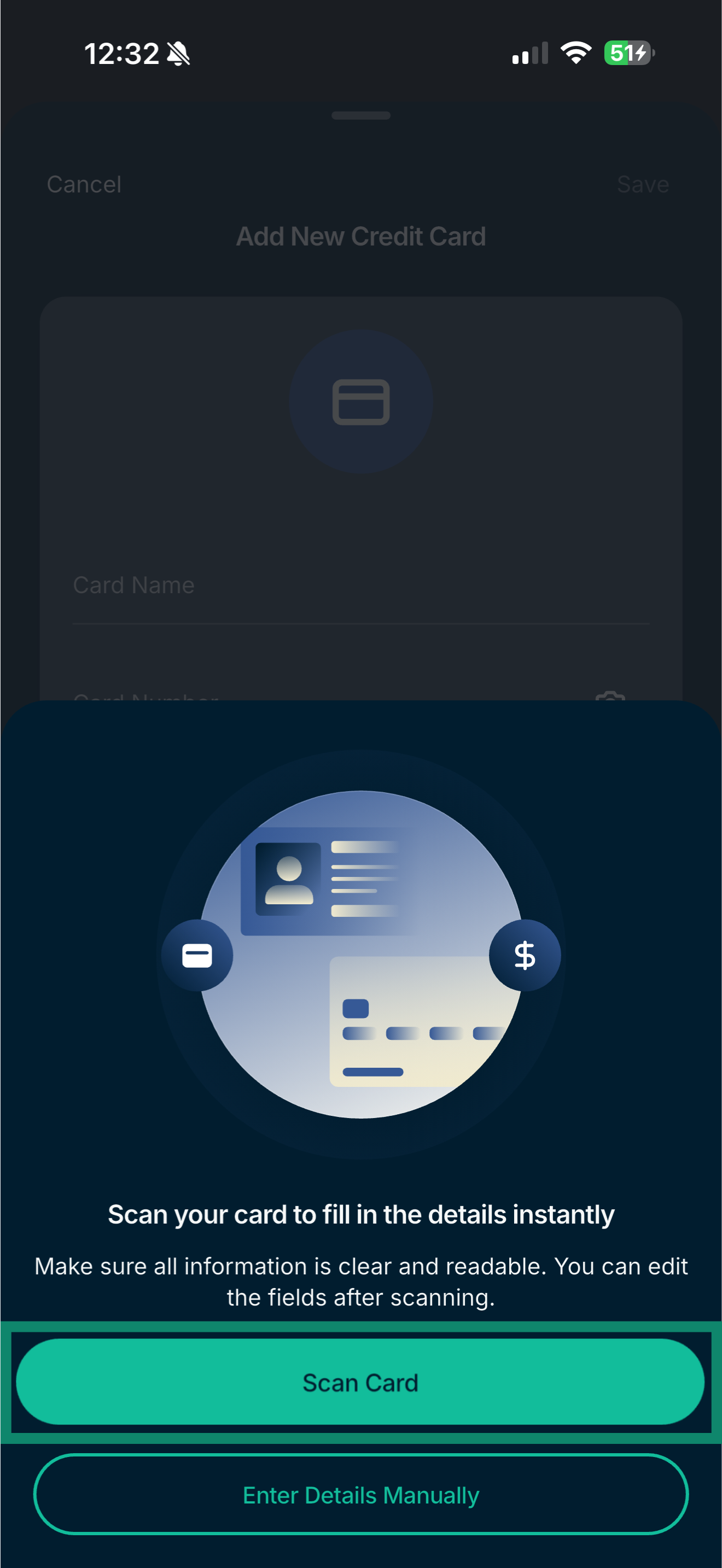 You can use your iPhone camera to quickly add your card details. You need to allow camera access to do this.