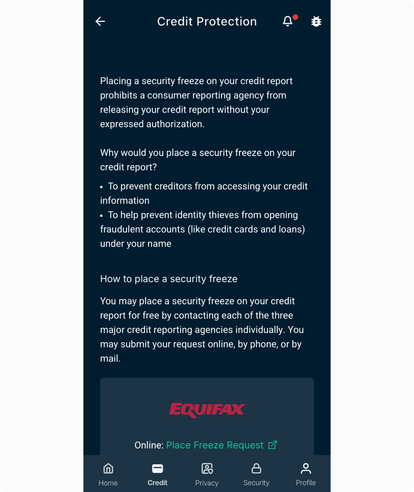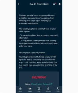 Credit Protection provides helpful information on how to contact the three credit bureaus to request a freeze on your credit. Freezing your credit will prevent creditors from approving any new credit account in your name, whether it is fraudulent or legitimate. To view the contact information: