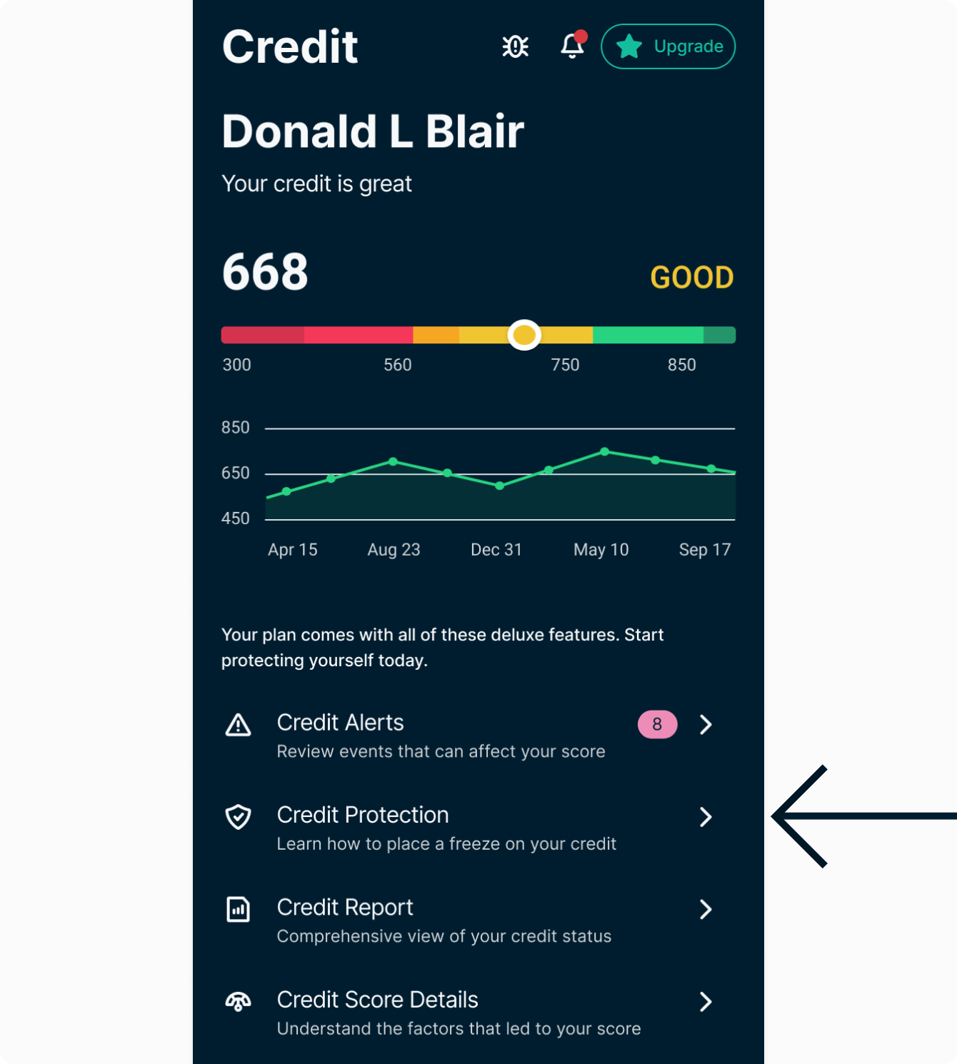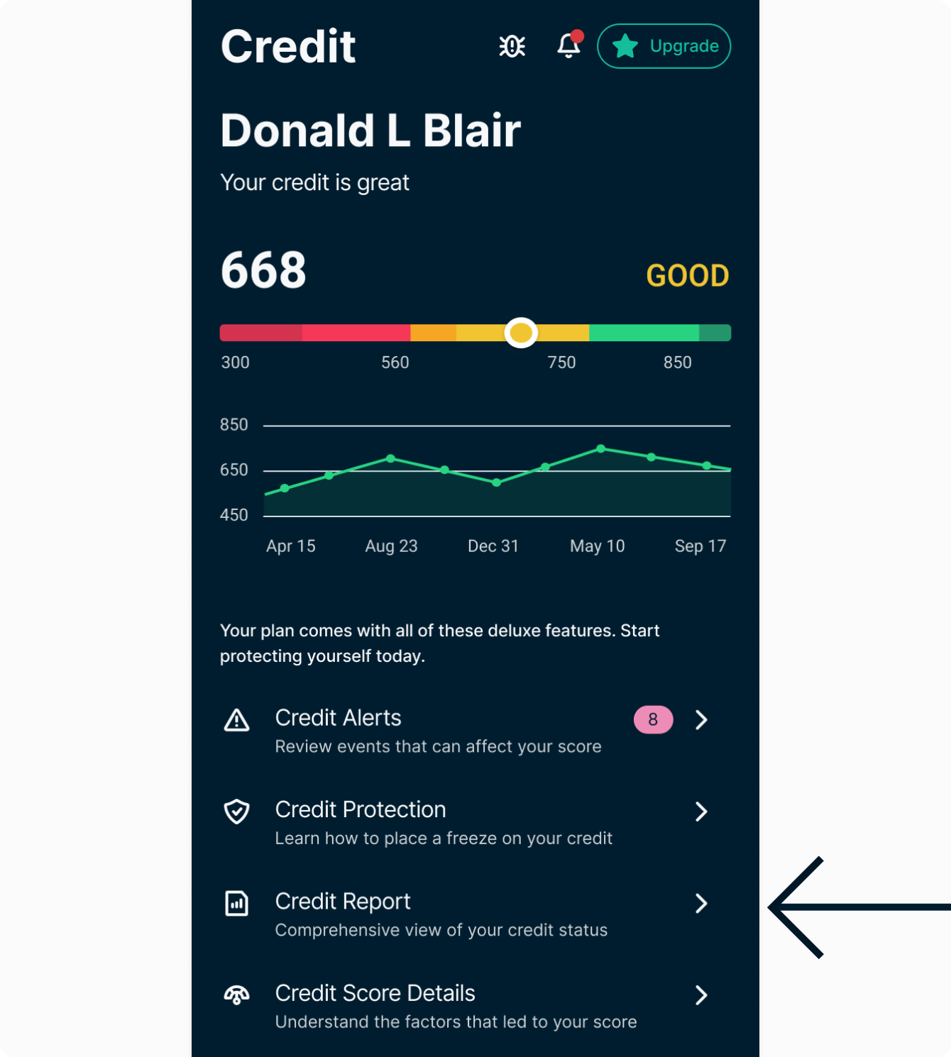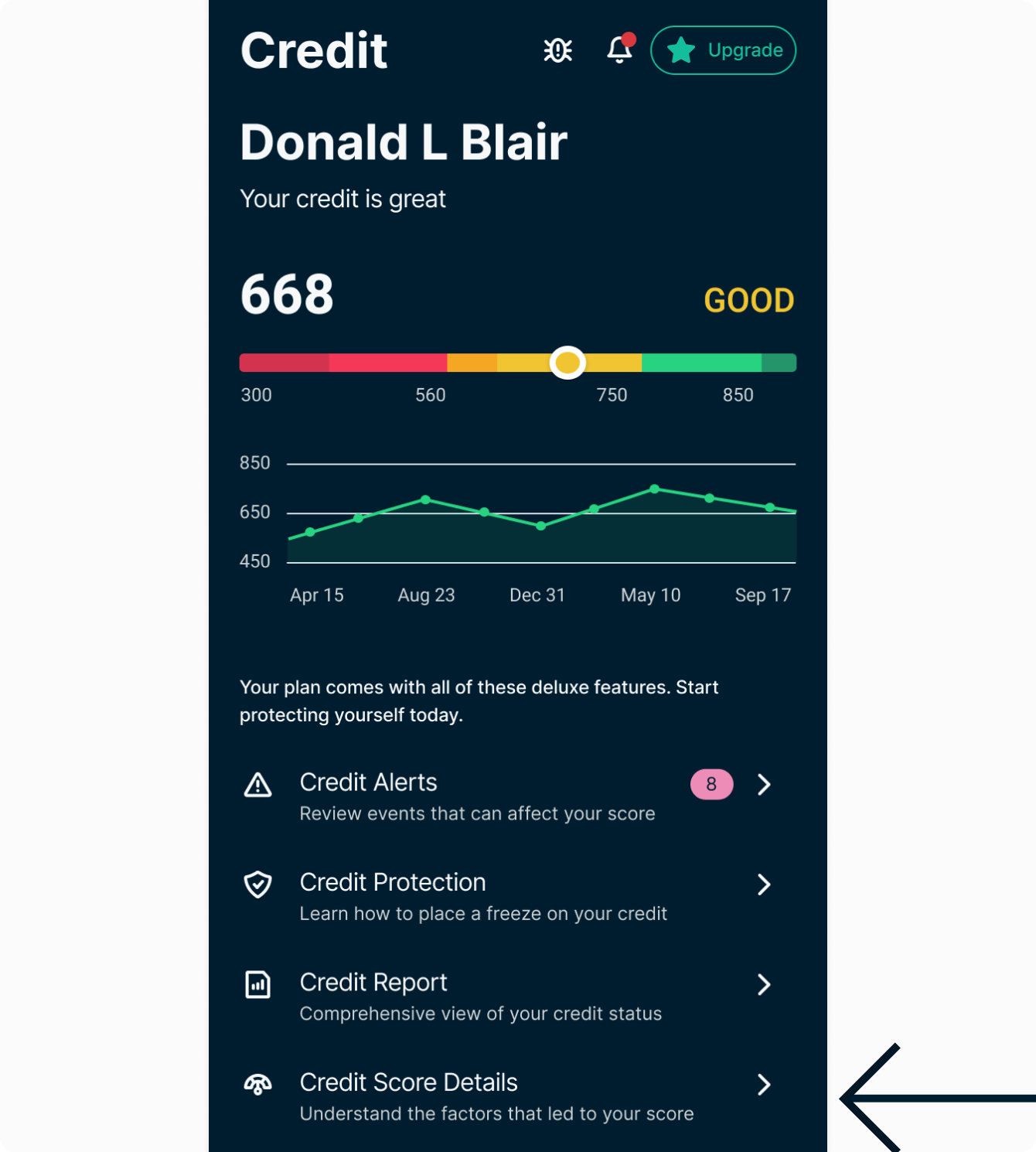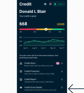 Credit Score Details explores the factors that impact your credit score and whether they are affecting you positively or negatively. Each negative item also recommends actions. To view: