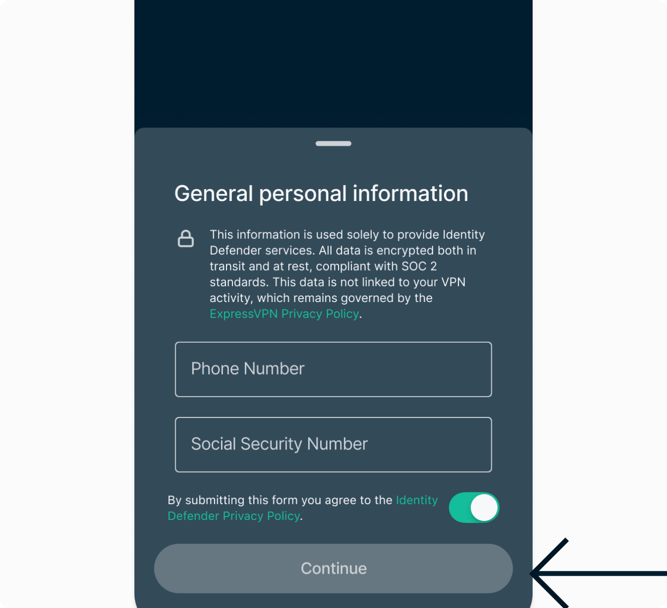 - You will be asked to enter your personal information. If you have previously set up an Identity Defender service, you won’t have to re-enter the same information, but you will need to input your Social Security number and phone number in order for us to provide your credit details. Select Continue.