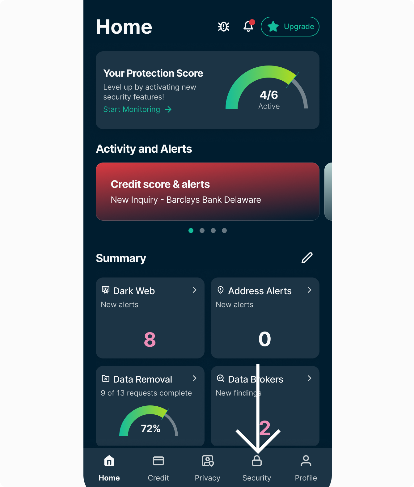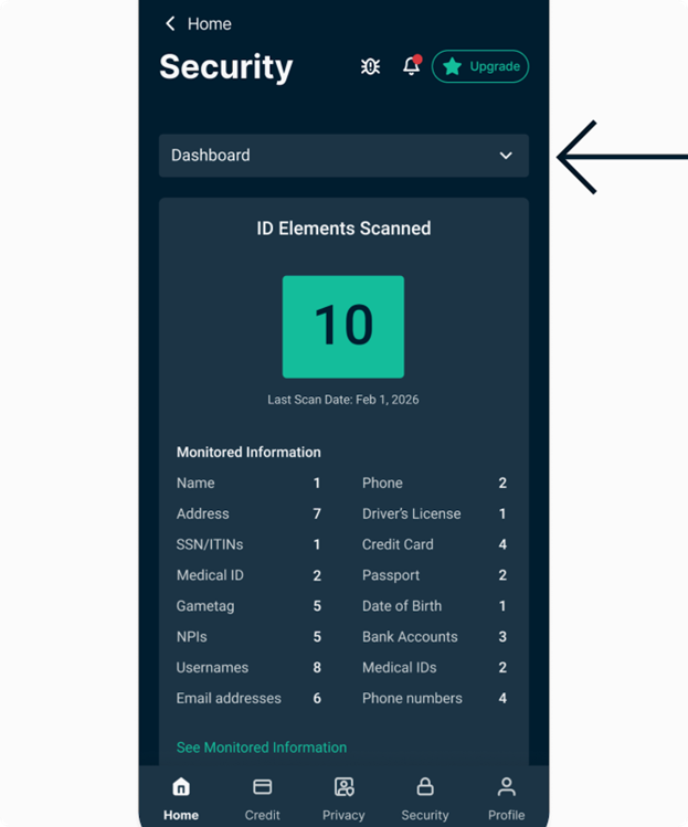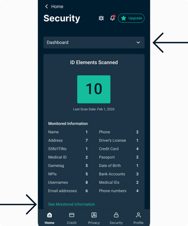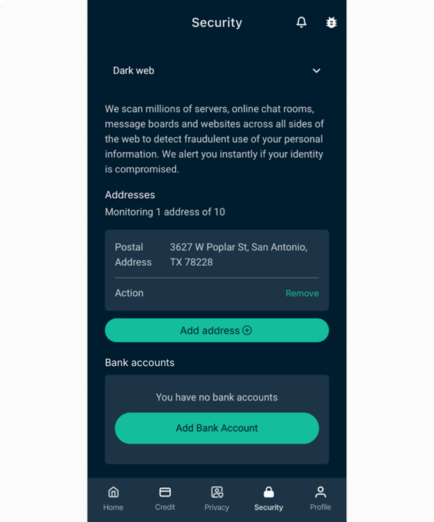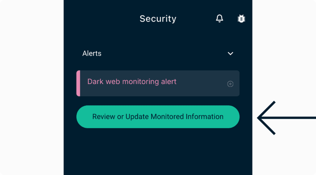 - Here, you can review any active alerts (like Dark web monitoring alerts) and tap the Review or Update Monitored Information button to take immediate action.
