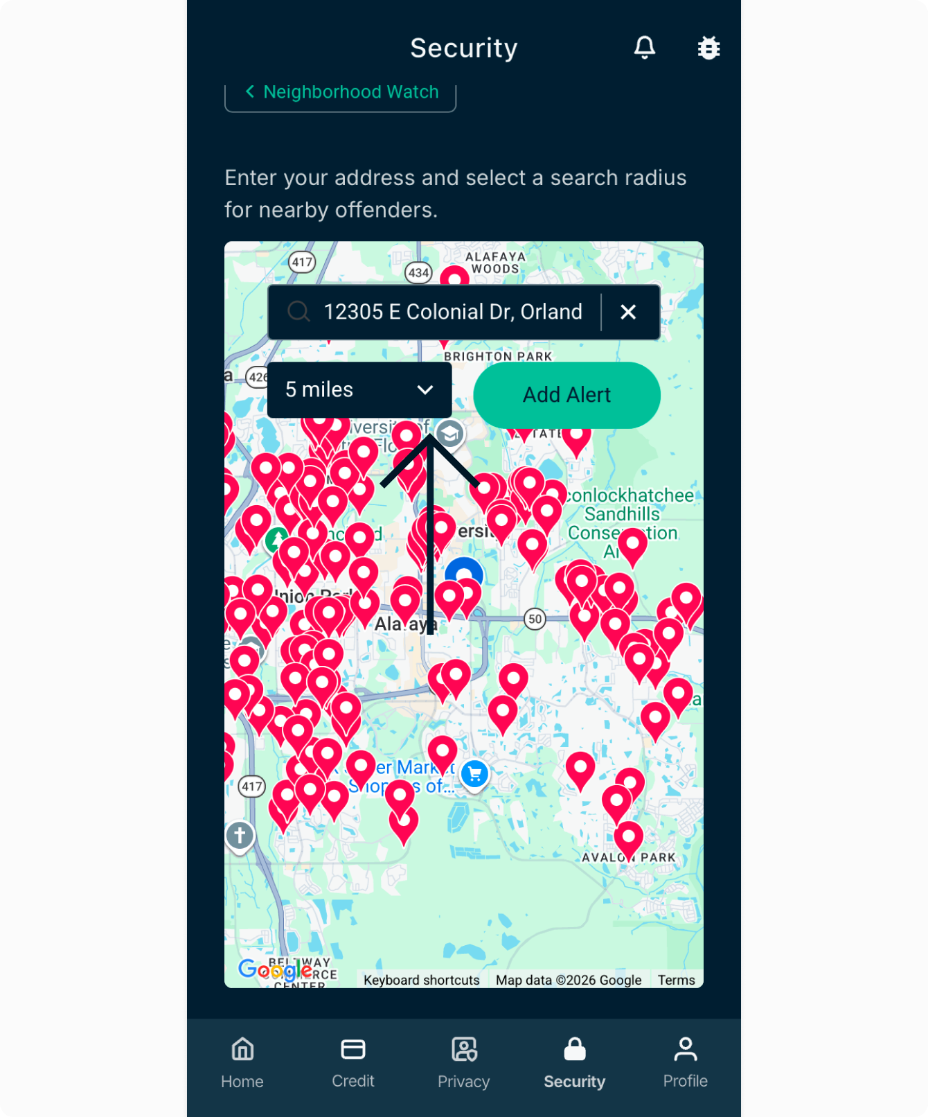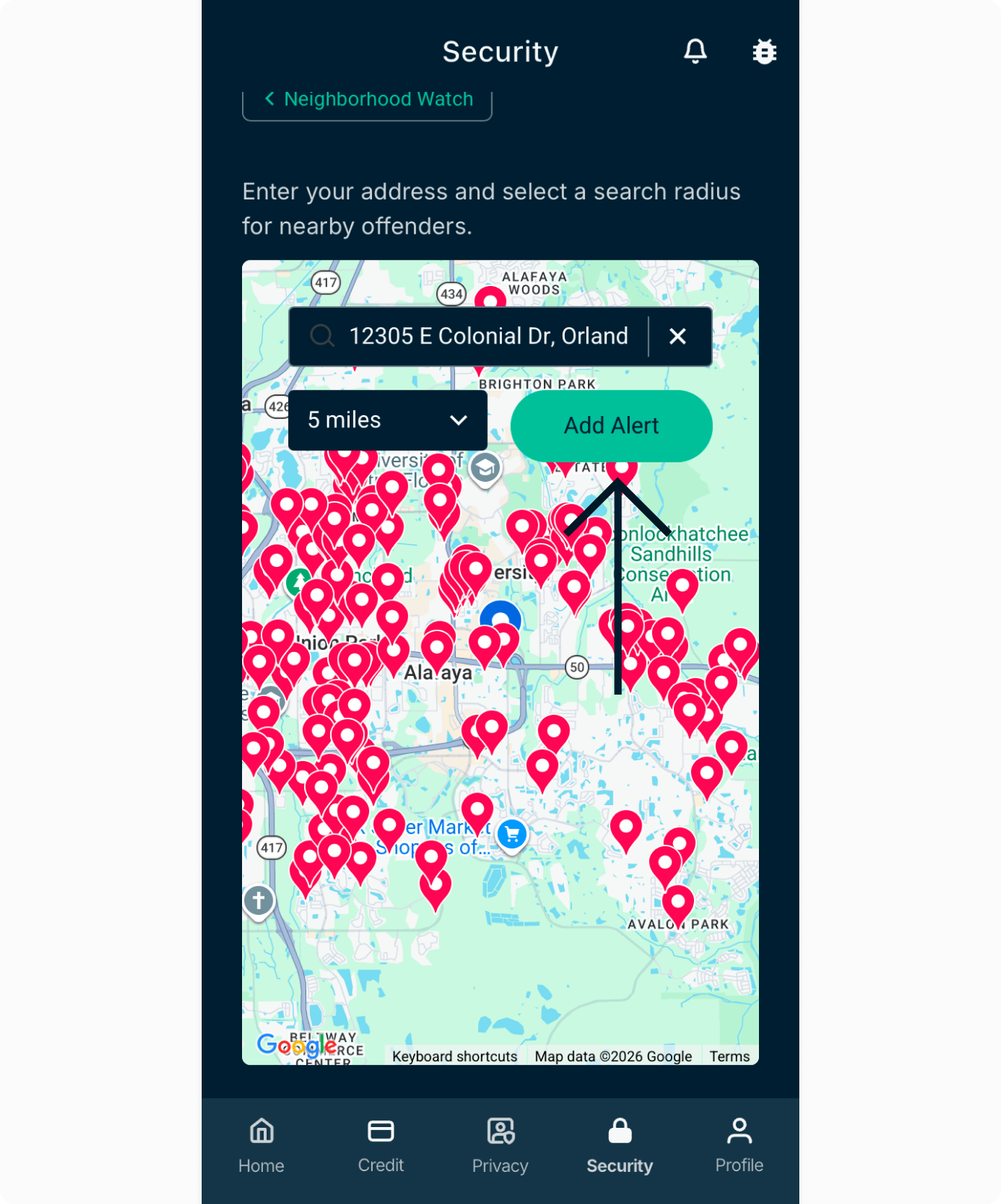 You can also add alerts so you are notified whenever a new registered sex offender is in your neighbourhood. To do so: