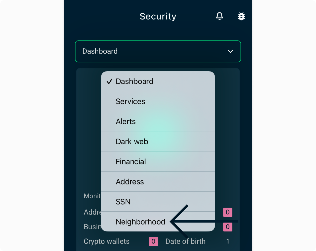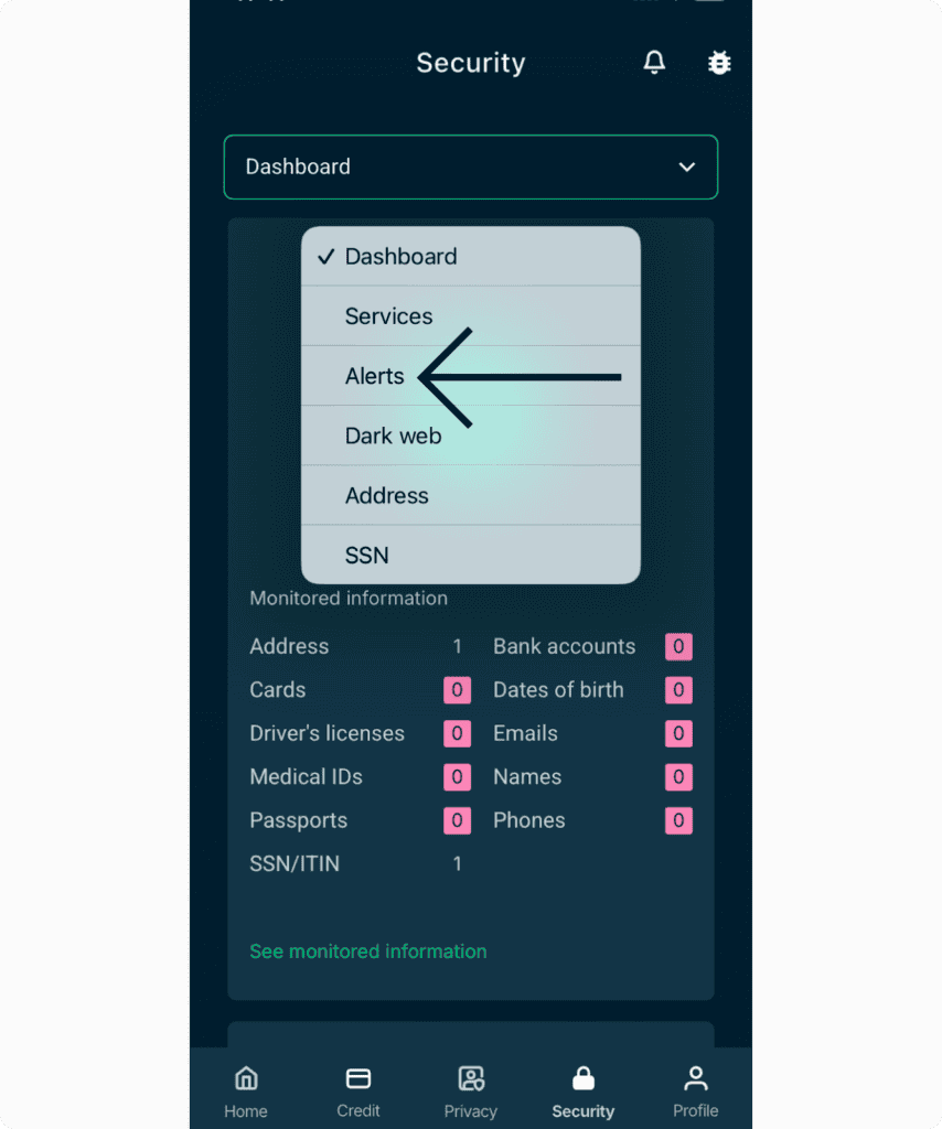 - Tap the dropdown Dashboard at the top and select Alerts.