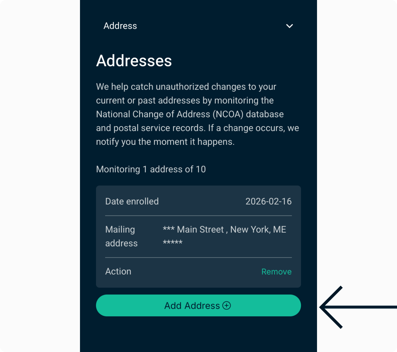 Tracks unauthorized address changes that could indicate identity fraud or mail redirection scams. Alerts you if their address is updated without your knowledge, helping prevent missed bills, stolen mail, or account takeovers.