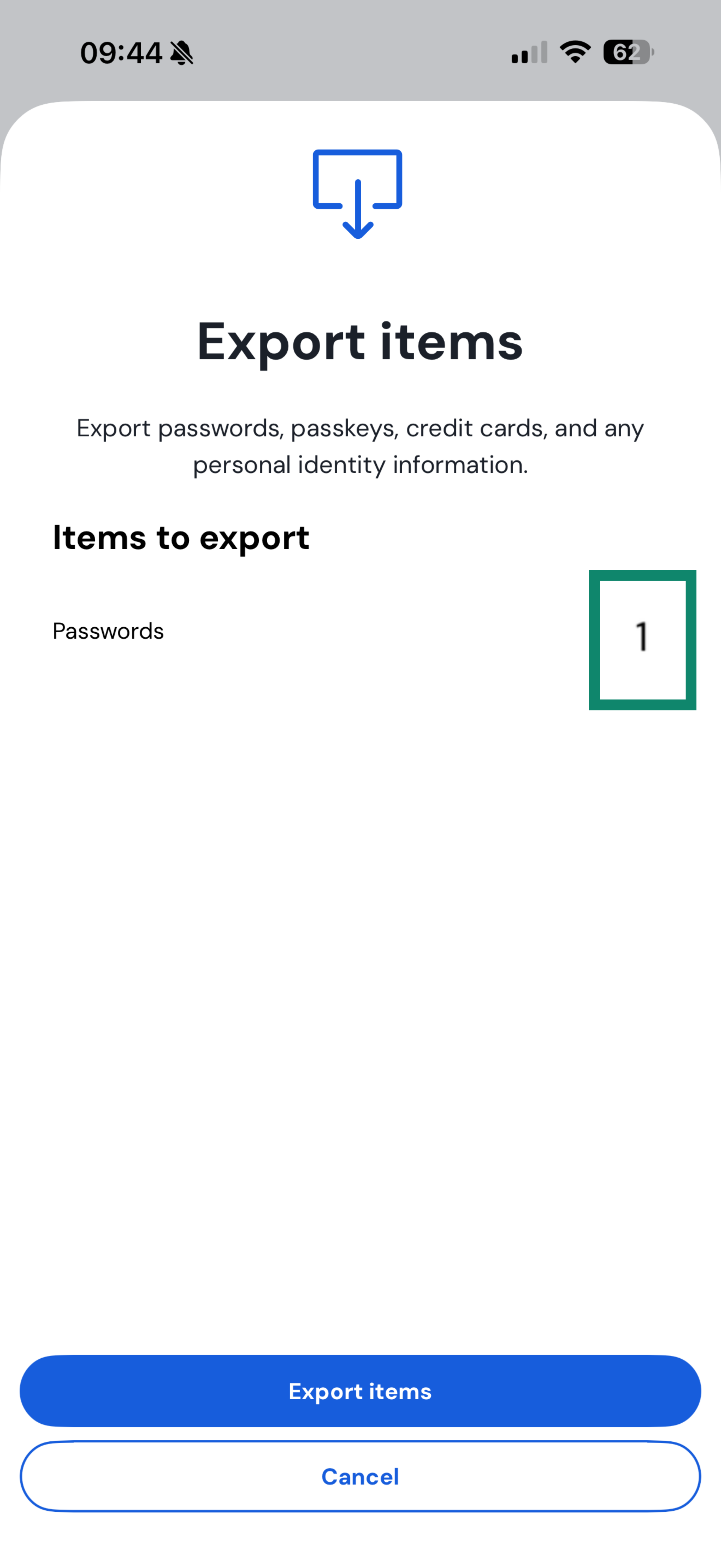 - Select the items you want to export, then tap Export items.