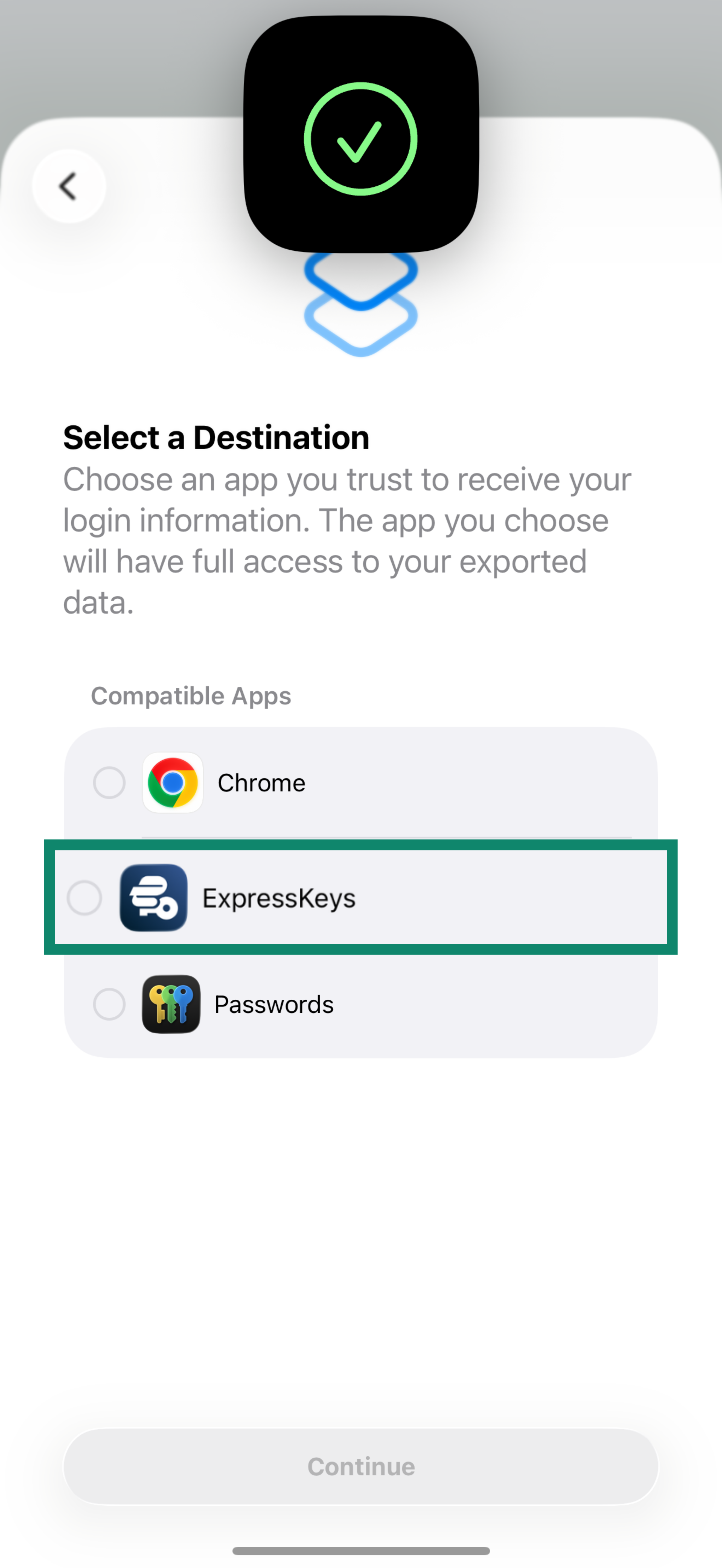 - Wait for the app to import your passwords, then tap Continue.