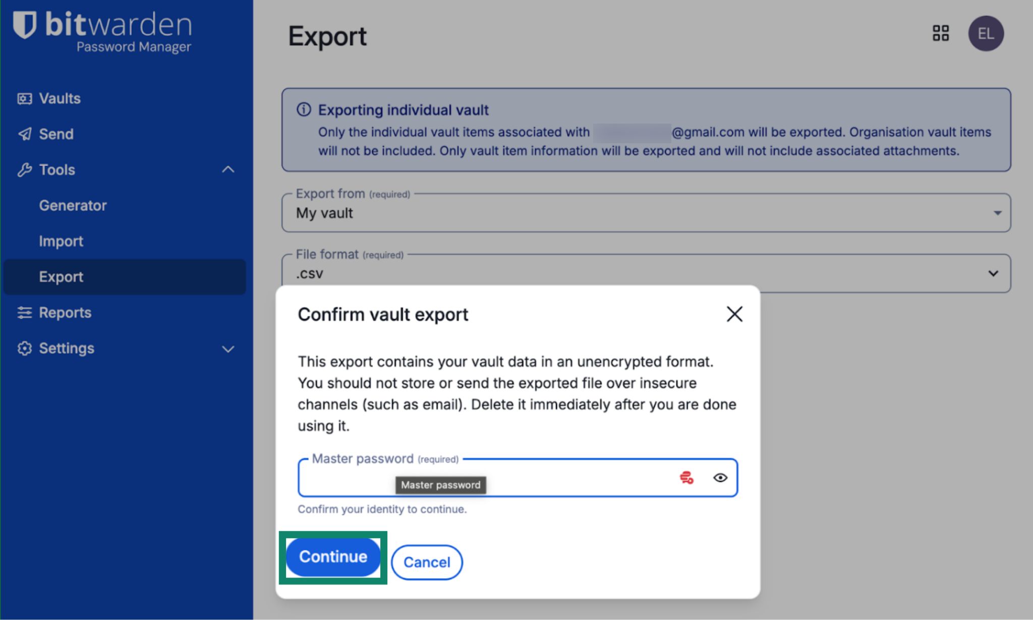 - Enter your master password and click Continue.