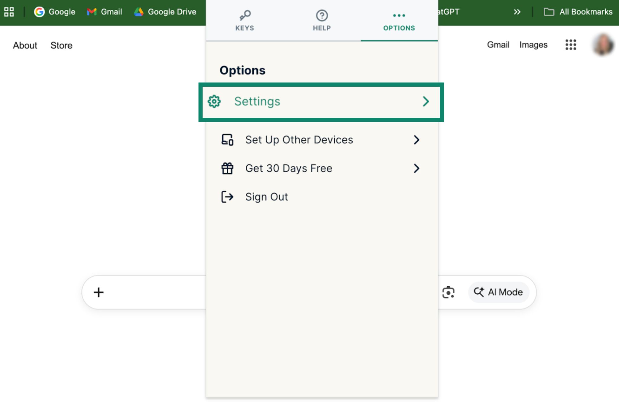- Click the Options tab > Settings.